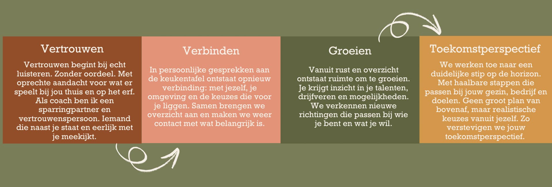 Vier heldere stappen vormen de basis van mijn aanpak. Samen bouwen we vanuit rust en vertrouwen, via verbinding en groei, aan een toekomst die past bij jou en jouw bedrijf.