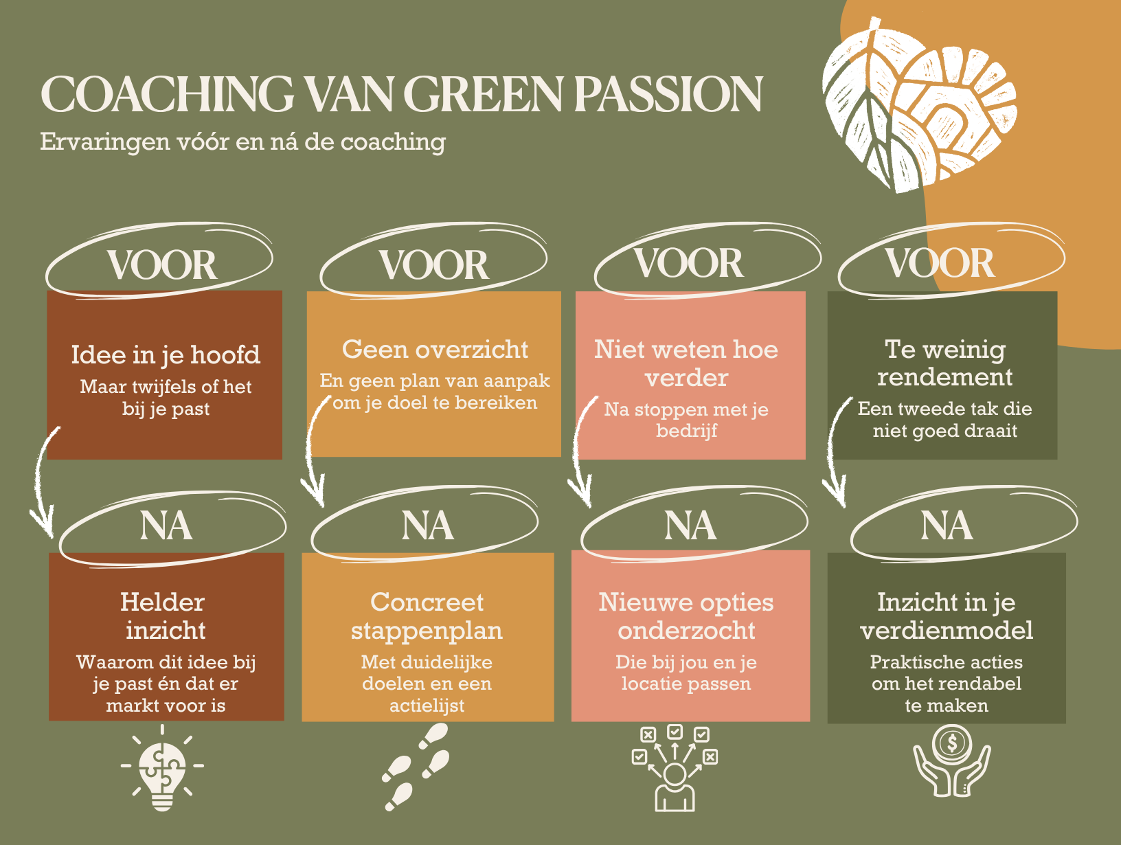 | Geen overzicht en geen plan van aanpak om te komen bij je doel | Concreet stappenplan met duidelijke doelen en actielijst |
