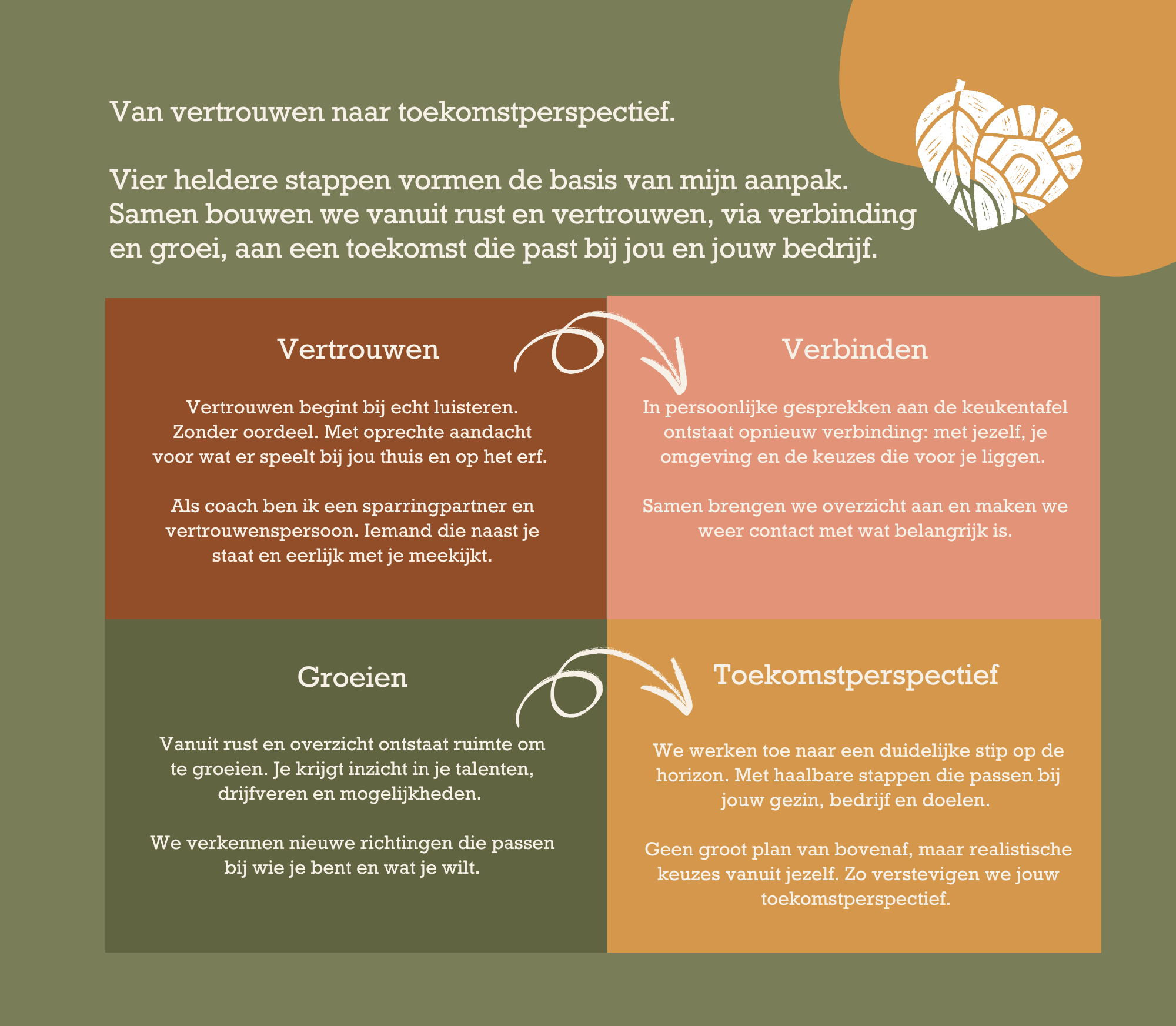 “Ik heb ideeën zat… maar welke passen nou écht bij mij? Hoe zet ik de volgende stap zonder verdwaald te raken in plannen en papieren? Ik zoek iemand die met me meedenkt, die begrijpt hoe het bij ons thuis en op het erf gaat. Geen dikke rapporten, maar een sparringspartner die helpt orde scheppen in de chaos en me weer richting geeft voor ons familiebedrijf”